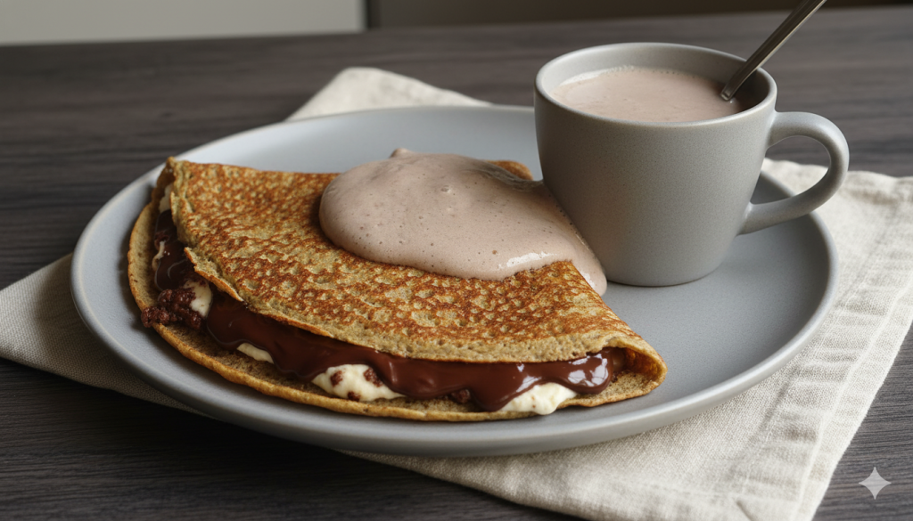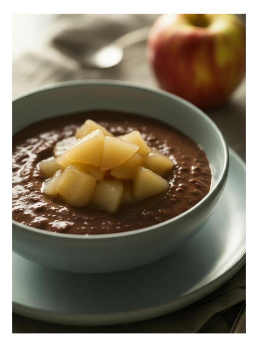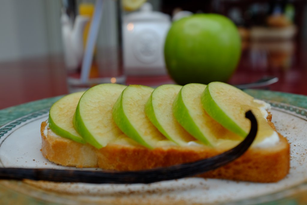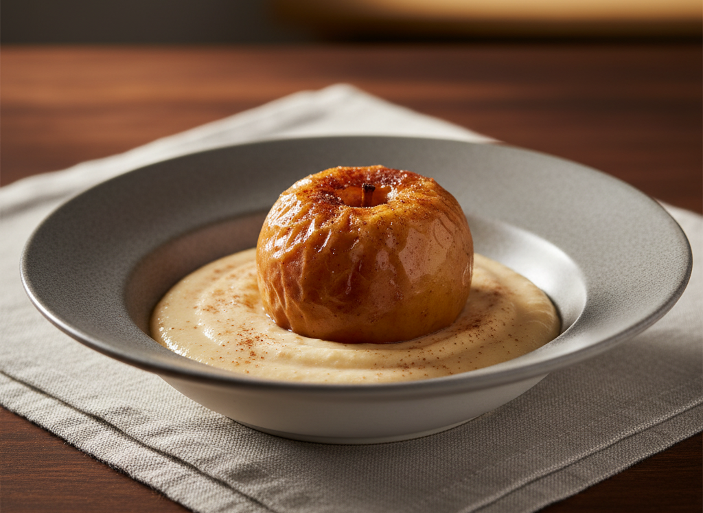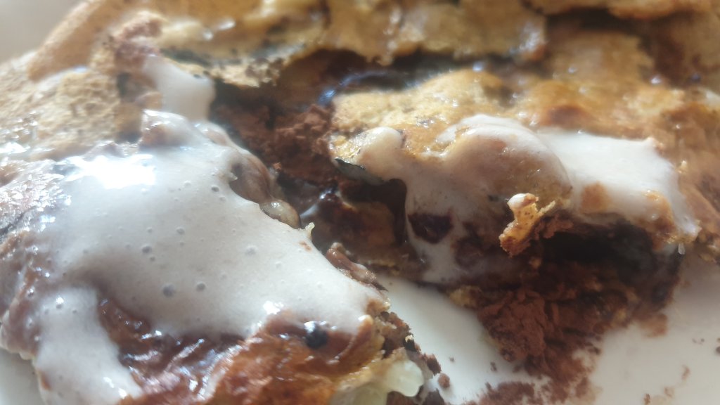 Le dessert, le bouquet final, était une pomme cuite au four à la cannelle, servie dans une crème à base de banane. Ceci était accompagné d'une crêpe faite avec la même base de sarrasin et de lupin, agrémentée de chocolat noir et d'un peu d'huile de noix, en plus de la crème de banane.